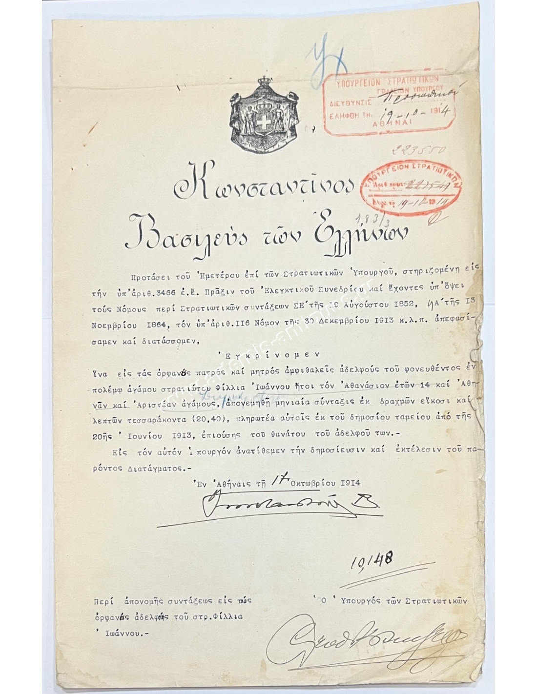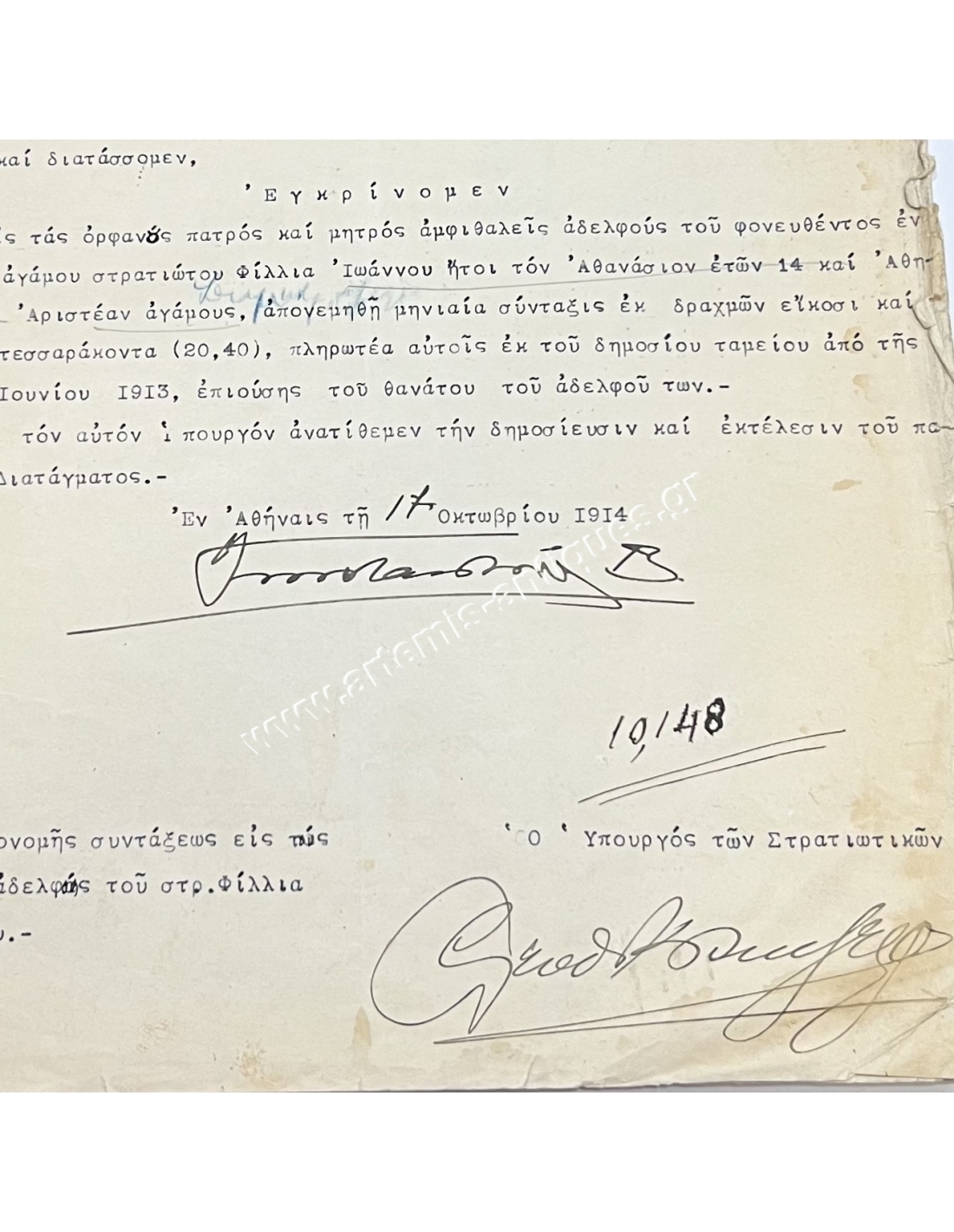 Απονομή Στρατιωτικής Συντάξεως 1914, Υπογραφή Ελευθέριου Βενιζέλου και Βασιλιά Κωνσταντίνου