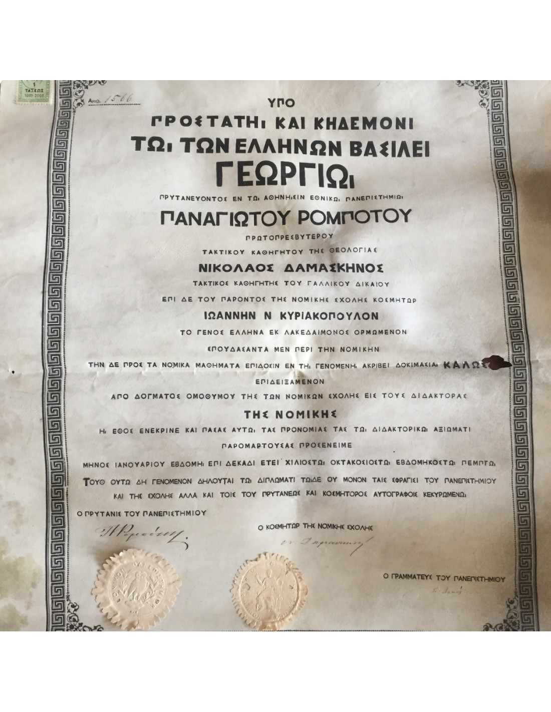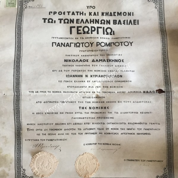 Greek King Othon's University Degree in Law 1875 King George's era